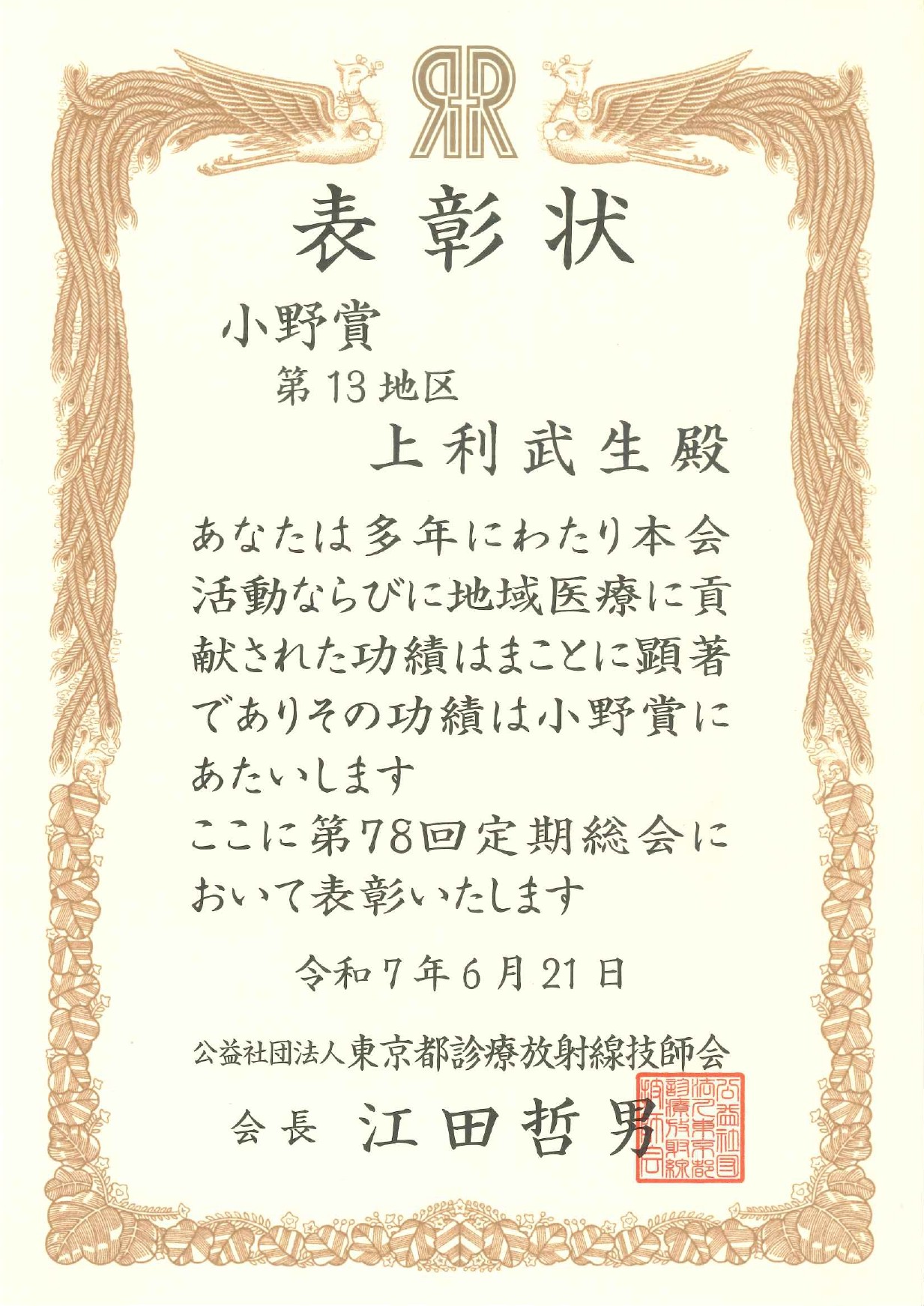 東京都診療放射線技師会より小野賞を受賞いたしました。